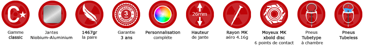 Avec une jante spécifique au freinage à disque en total U Niobium-Aluminium de 445gr, 26mm de haut, 24mm de large pour 1467gr la paire, un magnifique voile noir mat/satiné recouvre cette jante aluminium haut de gamme. Cette jante est compatible pneus classique ou tubeless (si vous choisissez le tubeless nous vous monterons le scotch et les valves d’origine, pour les pneus classiques les fonds de jantes seront fournis).