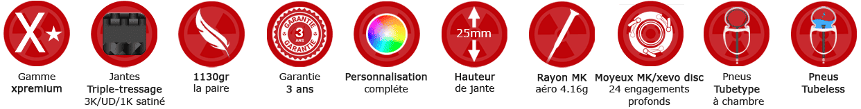 Nos jantes MK xpremium 100% carbone total U de 26mm de large sont techniquement inégalées. Un triple tressage 1K/3K/UD T800 à haute tension et son poids ahurissant de 315gr. Elles seront des alliés rêvés de tout passionné. Elles possèdent des fonds de jantes par bandes de graphène permettant d’augmenter encore la structure de jante. Des crochets HTH (Hard Tech Hook) donneront une résistance optimale pour l’accroche du pneus et seront 100% compatible tubeless.