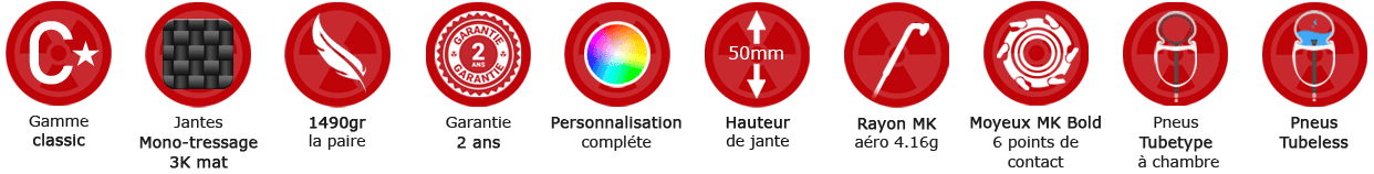 Notre entrée de gamme en 100% carbone aéro à pneus d'une hauteur de 50mm pour 1490gr la paire.