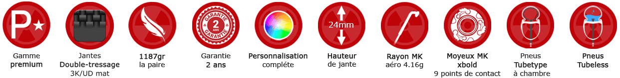 La jante MK premium 100% carbone semi U double tressage 3K/UD T800 en finition mat donnera une explosivité hors norme en filtrant les aspérités de la route, les xslim 24 vous donneront une très bonne fraîcheur en fin de sortie. Elles restent néanmoins très polyvalentes pour les parties moins pentues et ne brident pas le cycliste.